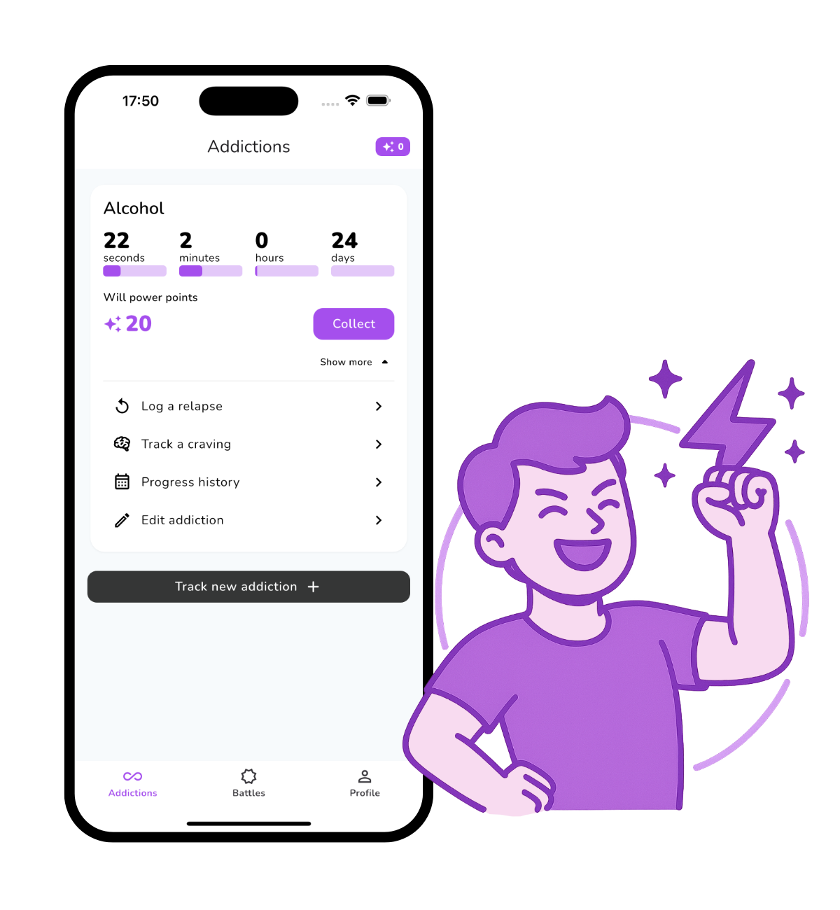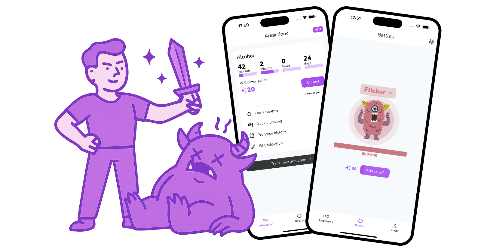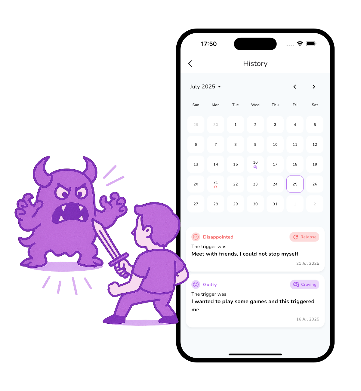 Log your cravings and relapses. Along the way you will face monsters that represent your addictions. Use your willpower points to defeat them. Each victory brings you closer to breaking free from your bad habits.